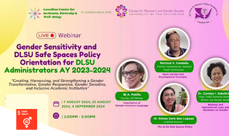 Additionally, in August to September 2024, LCIDWell and the UP Center for Women’s and Gender Studies (UPCWGS) held a joint webinar entitled Gender Sensitivity and DLSU Safe Spaces Policy Orientation for DLSU Administrators AY 2023-2024. The three-day webinar tackled topics on strengthening gender inclusivity in academic institutions, featuring talks from LCIDWell Director Dr. Estesa Xaris Que Legaspi, UP professor BJ A. Patino, Former National Youth Commissioner Percival V. Cendana, and the Chair of Commission on Higher Education (CHED) Technical Panel on Women and Gender Studies Dr. Carolyn I. Sobritchea. In November 2024, LCIDWell Program Head for GADSS Mr. Christian Derek S. Guerra and Mr. Fritz Gerald Martin from DLSU Community, Culture, and Human Resources Services Office presented talks on gender equality, safe spaces, and gender identity in the workplace in a seminar organized by San Beda University Manila College of Nursing (SBU-CON).