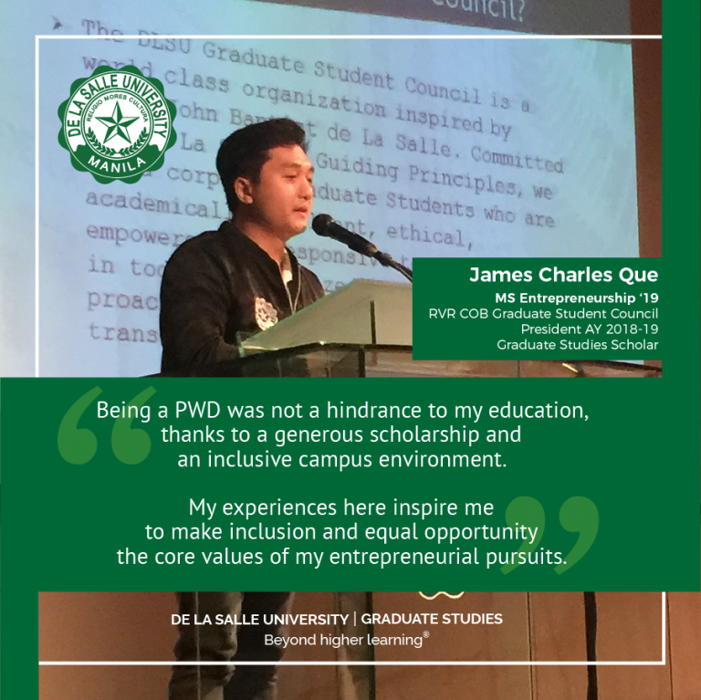 The scholarly groundwork laid during his undergraduate years truly flourished in graduate school. As a St. La Salle Scholar, James pursued an MS in Entrepreneurship while starting out teaching for the night classes at De La Salle – College of Saint Benilde which he thought of as a way of giving back to the Lasallian community. He thought that the program would further sharpen his entrepreneurship and business development skills. Concurrently, he was elected and served as the Graduate Student Council President (2018–2019), where he championed initiatives that unified the student body. “We organized inter-school competitions, quiz bees, and community masses. We were very happy that our events were always jam-packed,” he recalled, demonstrating an early ability to blend academic life with community building.