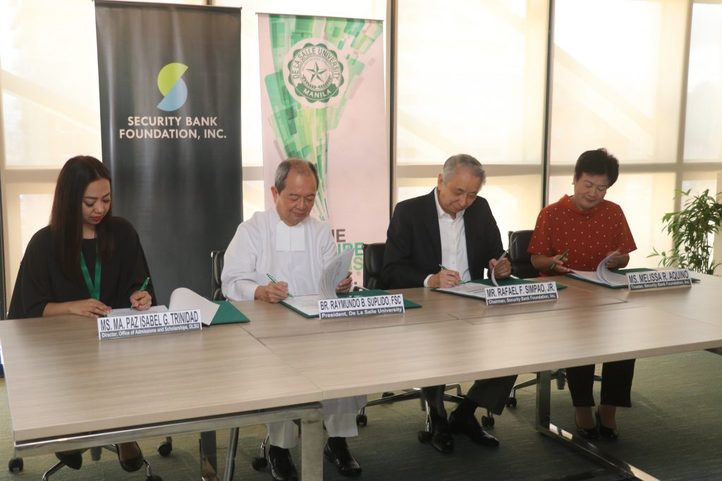 Security Bank Foundation Inc. (SBFI) signed a Memorandum of Agreement (MOA) with De La Salle University to support qualified students taking courses related to bank operations such as Accountancy, Business, Management, Finance, Industrial Engineering, Information Technology, Computer Studies, Mathematics, Statistics, Communications, and Social Sciences.